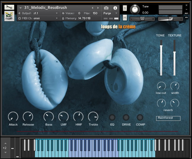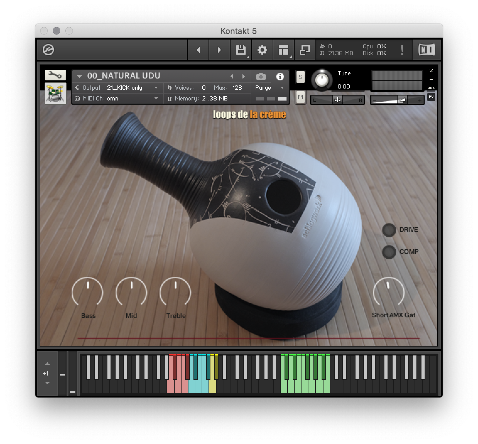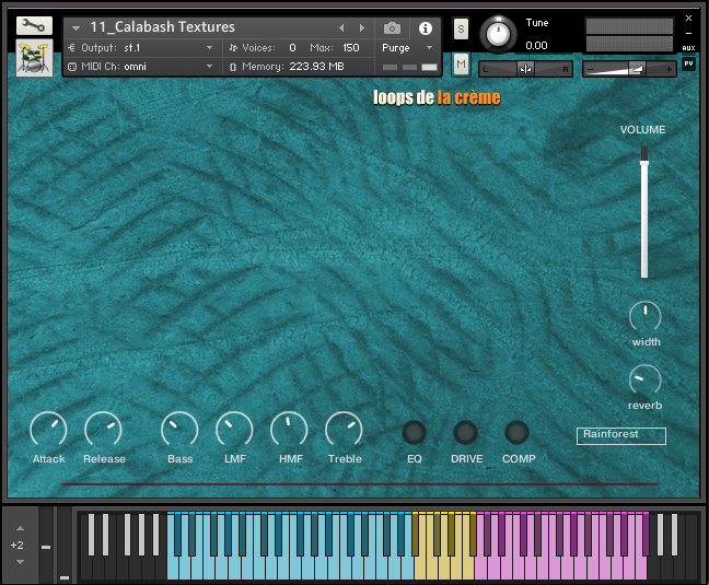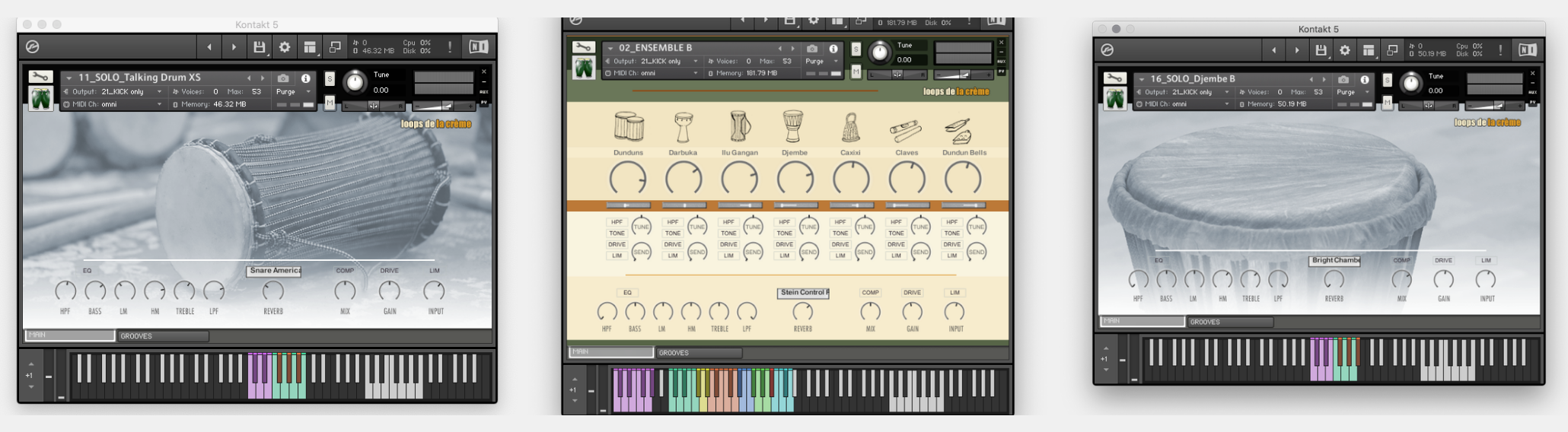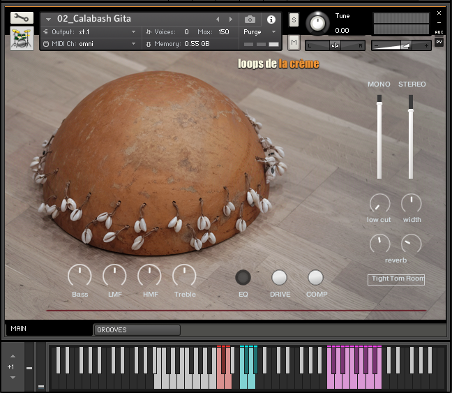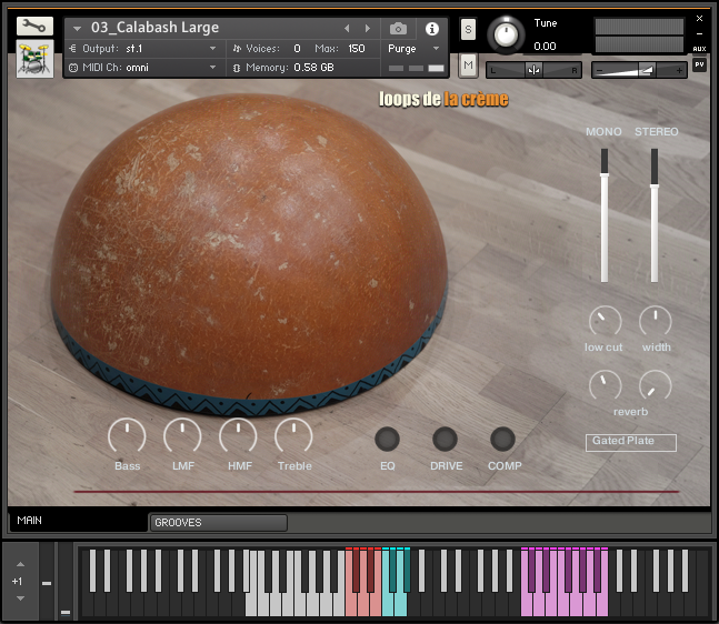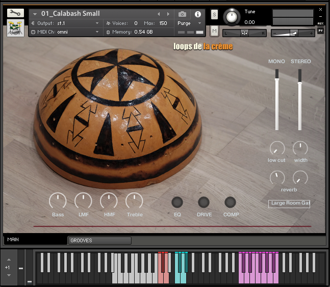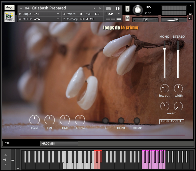 The ‘Prepared Calabash’ follows the same keyboard mapping as the three natural Calabash instruments, with a unique ensemble of samples recorded on the three calabash drums.