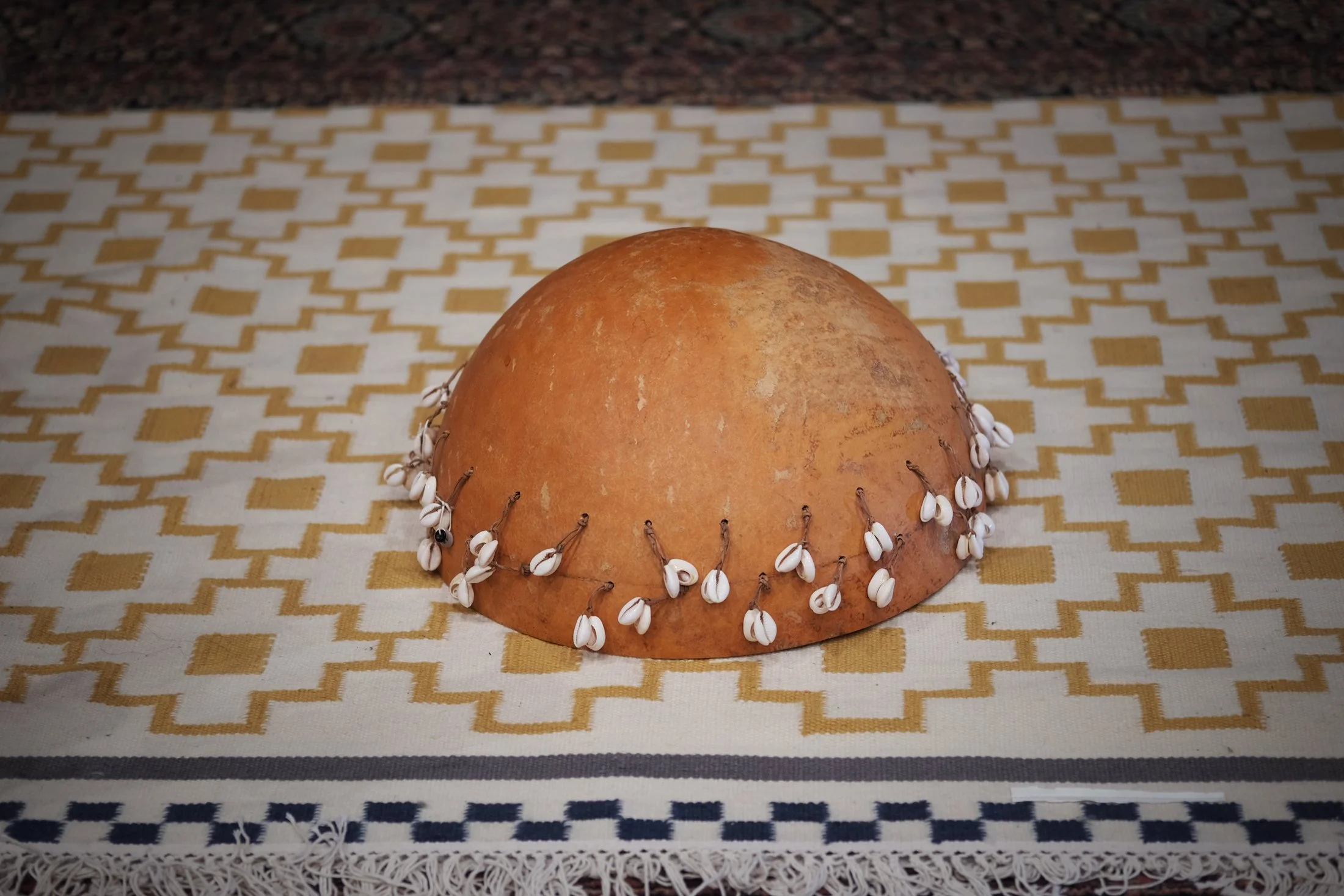 The gita features cowrie shell pairs attached around the open rim. It can be played like a drum, or it can be girated in two hands causing the shells to hit against the gourd in rhythm. A wonderful and very expressive instrument! Hand-made in Mali. Diameter: 41cm