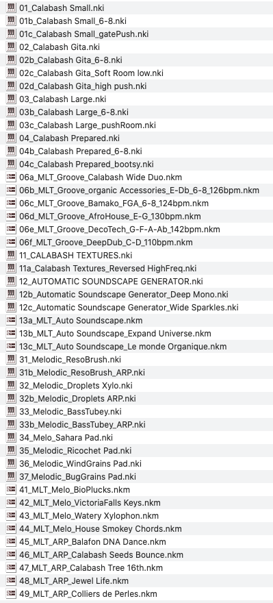 The library includes 10 nki melodic instruments, and 9 melodic nkm multi instruments.