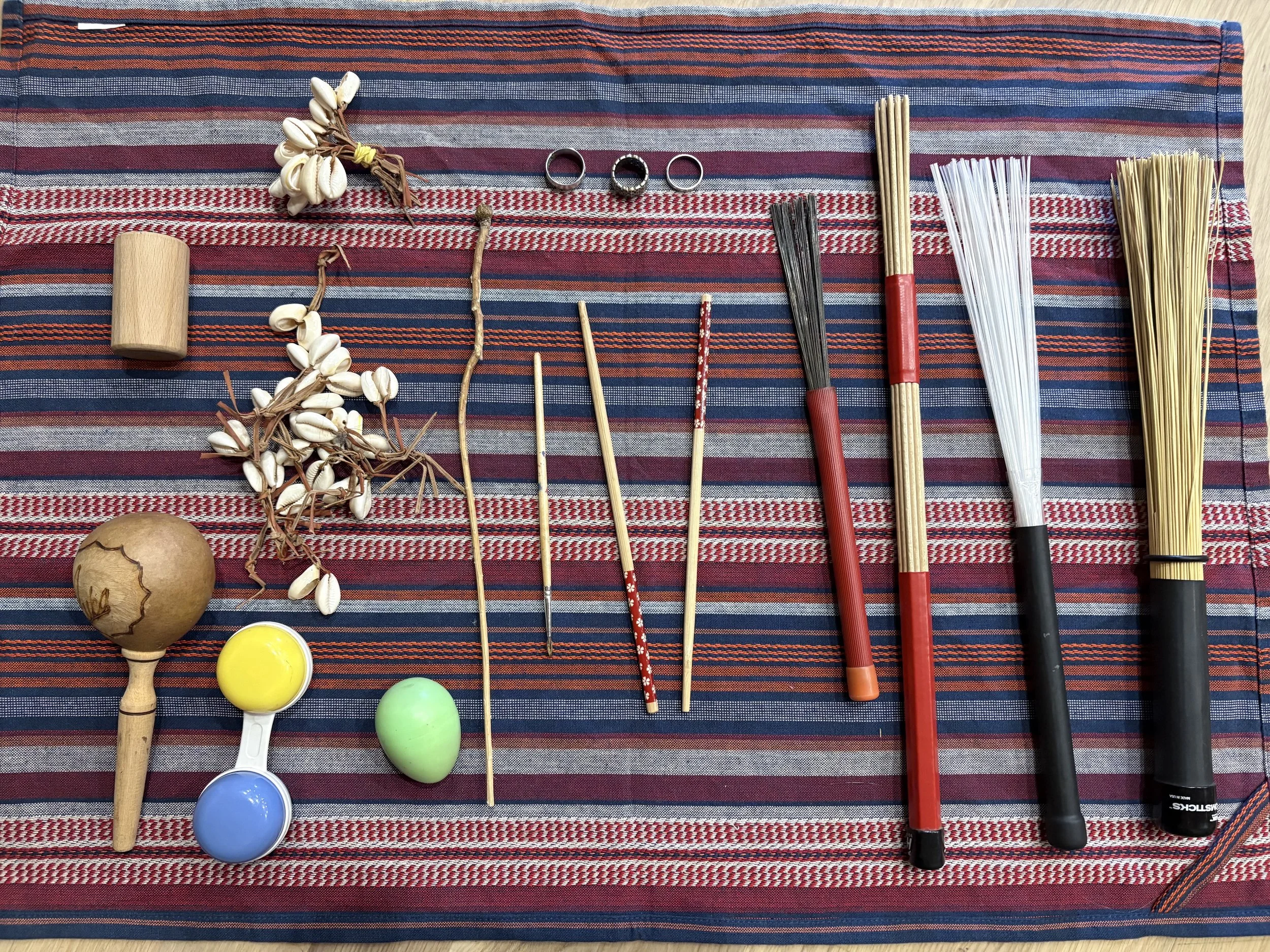 To create a wide range of colourful, textured sounds, many extra accessories were used (brushes, sticks, shells, other shakers, …)